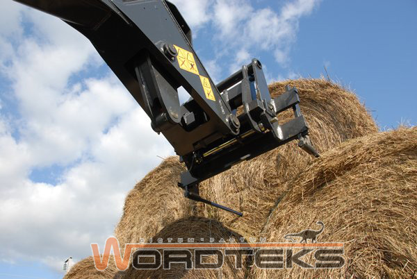 Погрузчик тюков для транспортировки и погрузки круглых тюков сена с земли на трейлер или в подающее устройство тюков.